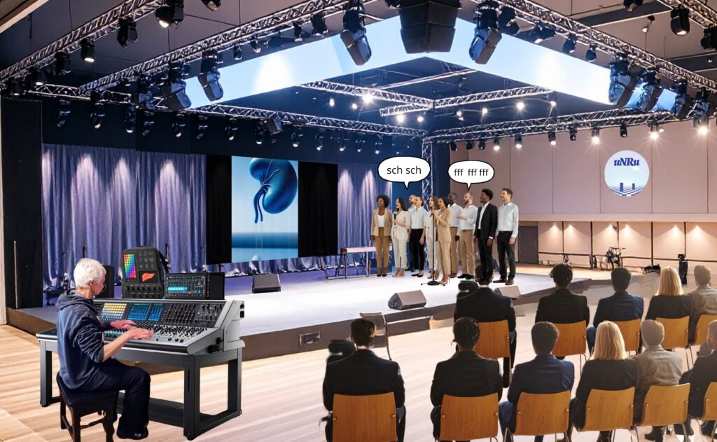 Le second prend corps dans des performances-concerts, où les pulsations colorées s’affranchissent du silence et rentrent en dialogue avec une matière sonore, inspirée par les travaux de Meredith Monk sur la voix pré-verbale et les gestes vocaux archaïques. Un para langage vocal reposant sur des soupirs, raclements de gorge, souffles, sifflements, gémissements, grondements… autant de micro-événements acoustiques spontanés, fragmentaires, qui échappent au langage articulé. Dans cette perspective, la voix est envisagée comme une matière première organique, une prolongation de l’émotion viscérale et de l’être-ensemble. Les pulsations chromatiques répondent ou précèdent ces émanations sonores, créant des interactions sensibles, parfois imprévisibles, entre perception visuelle et vibration acoustique. Il ne s’agit pas d’un simple accompagnement visuel du son, mais d’une co-fabrication sensorielle, où les éléments pulsatifs deviennent autant porteurs d’émotion que les sons eux-mêmes. Le dispositif, résolument collectif et inclusif, invite le public à contribuer activement à l’édification d’une figure commune, mouvante et pulsative. Chaque individu, par son action ou son fragment sonore, vient tisser la texture vivante d’un corps collectif éphémère, porteur d’une musicalité à la fois archaïque et futuriste.